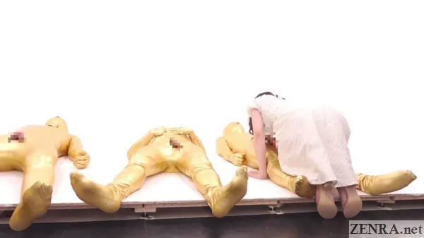 If we had to pick one of the craziest encounters, it would be the ZENTAI handjob game where two of the matronly women are instructed to provide hand and mouth service to full body suit-clad men. The penalty comes into play if they actually choose their male companion as they will then have to have sex in front of him with one of the actors (!).