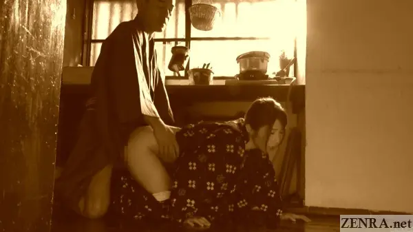 A SHOWA TALE OF AN AMOROUS CAREGIVER--as the name implies--takes place in the Showa Era, the time period that began in the 1920's and concluded with a the apex of Japan's bubble economy in 1989.  With a time span crossing decades, filming a 'Showa era' title can mean many things:  it can be an 80's tale of Japan's ascent to economic supremacy, a story about the reconstruction that took place in the 60's and 70's (or the youth revolt in the 60's), or in the case of today's update, a title about abnormal sex and infidelity that happens shortly after the conclusion of WW2.