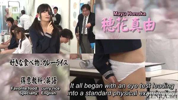 Sex with Japanese schoolgirls happens in NEW STUDENT PHYSICAL EXAMINATION DAY, but as the screenshots to the left imply, it sadly is not part of their medical examinations. Having a surprised female go all the way with a male student or a doctor for some abnormal medicinal reason WHILE everyone watches with indifference would have been the perfect way to end this. Instead, while we do get two sex scenes at the end, they're both short and take place after everyone is gone. Not a perfect opportunity, but the filming of these scenes and the title overall was top-notch. This is a picture-perfect movie with some great sound and a huge cast that makes the embarrassment as real as it gets. The five JAV stars nailed their roles as did the two doctors who were a subtitling treat.
