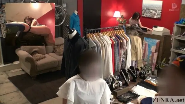 TEMPTATION CLOTHING SHOP with TSUBASA HACHINO sees an even larger cast including an additional female coworker. Adding women is the key point to make this realistic. Your guess is as good as mine whether we're seeing full-fledged JAV stars with their faces blocked helping out in a shoot, paid nameless extras, or actual crew members (like a makeup artist) doing double duty. Regardless, it helps make one believe this really is a clothing shop and those really are customers. Now unlike both DENTIST and SALON, CLOTHING SHOP is obviously a set. Keep that in mind because filming in an actual clothing shop presents some unique challenges compared to 'closed' offices like clothing shops and dental clinics. DREAM TICKET did a great job though in taking the huge WAAP studio and making one of its rooms a believable clothing store. The prep time for a JAV movie like this must have been intense. I also wonder where they got all that clothing from...