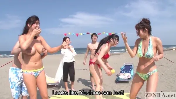 Japanese Milfs all with extra large breasts play a rowdy game of strip rock-paper-scissors on the beach.