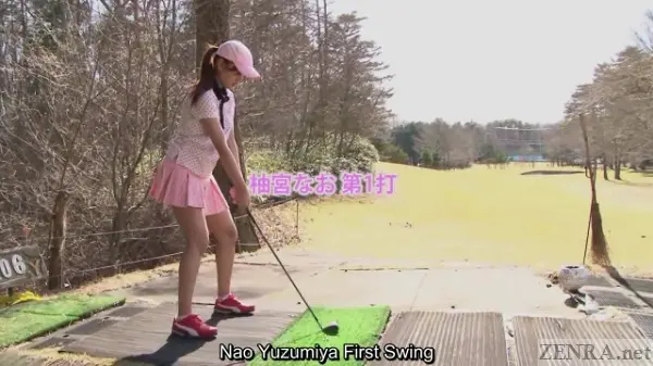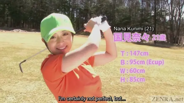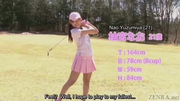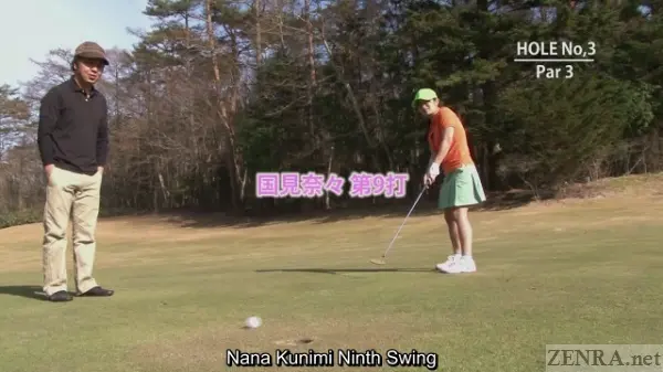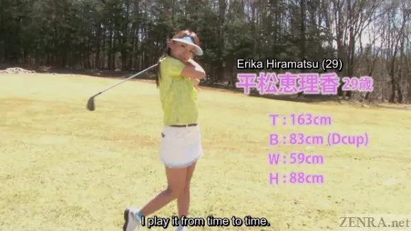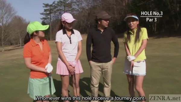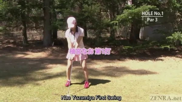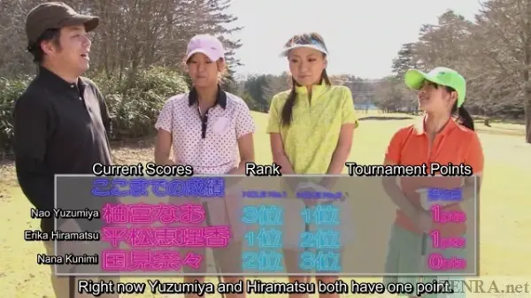 Ladies Golf Cup HD Uncensored The love of golf is universal. Even in Japan where flat lands that are not used already for some sort of development be it housing, farm land, etc. are not all that common when one needs it for a proper 18-hole golf course. Either way, it is a popular past-time among the increasingly aged population and folk also like it in limited numbers thanks to the likes of various younger Tiger Woods-type players. Japanese AV stars aren't immune to the sport and today three face off to become the quintessential tournament queen. Hosted by a jovial actor who has appeared recently as a mourning husband whose life 180'd via the introduction of a busty nudist maid and starring Erika Hiramatsu, Nao Yuzumiya, and Nana Kunimi, Ladies Cup Golf Uncensored HD successfully combines unexpectedly honed swinging skills with well-timed sexual 'awards' in the forms of penalty games. Golf is a tough game to master and it is the life's work of many. The three AV stars taking part are on the path to becoming formidable players and it shows. This is a not a simple production where golf is played out by participants who have never stepped on anything but a miniature golf course. All three players have their form down solid and make some pretty impressive shots. The rules are somewhat similar to the normal game: holes are by Par and the person who takes the fewest shots wins. Things go a bit awry from here though: penalty games are featured for screw-ups such as landing in a bunker (massager teasing), going out of bounds (fellatio), and swinging air instead of a ball (stark naked swinging practice). The player who finishes the hole with the worst score takes part in a sex penalty game and since this is an uncensored production filmed in HD, authentic nakadashi--or finishing inside without pulling out--is the name of the game. What's more, the golfers cannot wear any undergarments. Thus, under their polo shirts and short skirts is nothing but air and this is something the host enjoys pointing out by frequently using a golf club to raise a skirt or two always with the sharp acumen of blaming it on a sudden breeze. It works out well in the favor of fans who enjoy peeking at butts--and fortunately all three participants don't lack in this area. Pancake rear ends are nowhere to be found in this production (though don't expect 'thick' women as they also do not take part in this production, unfortunately). Some of the penalty games are filmed outside and others within a studio. Those with sharp eyes and a good command of capturing surroundings will take note that although the actual golf portion of the production takes place on an actual course, all of the outdoor penalty games take place in the same outside 'village' set featured in the recent Naked in School HD along with many, many other productions. These types of large sets are often shared amongst various Japanese AV production companies. The embarrassment during the nude swinging practice sessions is as real as it gets and the raunchier penalty games are shown up close and personal without a shred of mosaic to be found. Those wanting to see it all and then some will be very pleased. All three Japanese AV stars planned ahead for this special production and kept themselves prim and properly trimmed where it counts most. Scenes where penalty games are carried out do not feature too much dialog, but the actual golf portions are near non-stop with playful banter between host and increasingly embarrassed and sexually exhausted players. On-screen captioning such as score sheets and penalty announcements are also featured heavily and all receive the Zenra exclusive English subtitle treatment. The weather in a good chunk of the world may be somewhat inclement as far as going out to shoot a few rounds of golf is concerned so Ladies Cup Golf can serve as a nice 3-hour vacation for devout fans of the sport of sports. These three Japanese AV stars may be amateurs compared to the real pros of the game, but they all have put serious time in especially when it comes to proper swinging form. As one famous golf coach said, "It's all in the hips" and these three show that off sans underwear and ample amounts of embarrassment.
