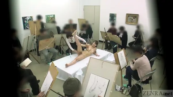 SOD concocts a delightful nude art scenario featuring a huge group of students, Myuu as the teacher, a built male model, and three eager faces.