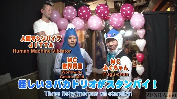 Delightful MC's in the form of the always engaging Abe-chan in a fish hat and one of SADISTIC VILLAGE's resident directors dressed as a volcano for some reason lead the way from start to sexy end. Later on, we even get "are you actually Japanese?" JAV actor Jitta Hanaoka to help out with his banana-clad manhood. (fun fact: Jitta may in fact be Korean if Wikipedia is indeed accurate).