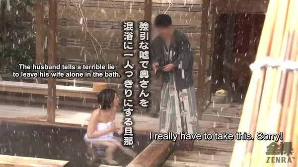 The flow of each of the three scenes is classic SOD from the setup to the quality and the inclusion of a '': the husbands are deeply into the hotwife fetish. Their wives until now have never actually had any sex with strangers, but have agreed 'this one time'. They believe what may happen may happen in private, not in and not in a 'mixed bath' of all places. After all, mixed bathing, a concept that's actually incredibly rare nowadays in Japan, involves all genders, but what we get--and where the works itself in--is due to strange coincidental elements, the only other bathers happen to be 'plants'. Yes, JAV actors who nail the part of amorous men just as the husband wanted and the wife agreed to though the location itself came as a surprise. Watching remotely with glee, we along with happy husbands sees how each encounter goes down and all do indeed finish with the most accurate way to NOT fake a creampie: the first squirt outside and the rest back in method.