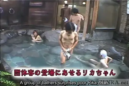 As we can see, a group of shy yet determined Japanese females are up for this challenge and with a large dose of guts and glory, each one sheds all their clothing and goes into the 'wrong' section of the onsen in their birthday suits to the delight and surprises of the bathing male patrons. Some girls simply walk in via a strange crab-like saunter doing their best to cover up their private parts while being ogled and quickly sink into a foaming hot spring to hide their nudity. Others are a bit more outgoing and one even helps wash a male bather and with only with the slightest bit of shyness and modesty, covers her breasts while squatting low in an attempt to hide her asshole and vagina from wandering eyes.