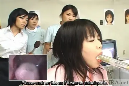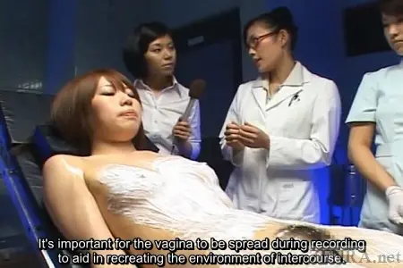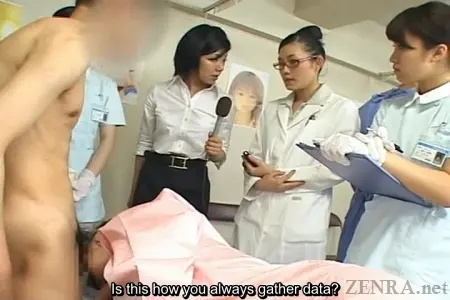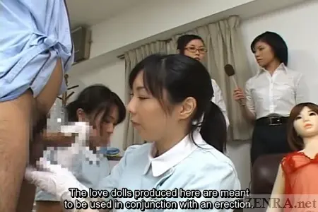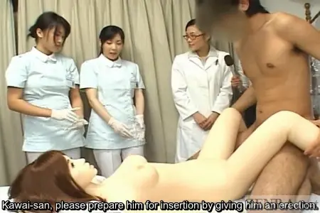 In a continuation of this scene, the news reporter now is observing another totally naked male volunteer who is giving his best effort to stay hard by engaging in coitus with one of Dr. Hattori's medical sex dolls. Both the doctor and her nurses encourage the volunteer to finish off in the doll while gently supporting him by caressing his clenching ass as he reaches his jizzy zenith.