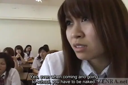 More specifically, since this is still in testing, only one day of the week, Tuesday, is designated as mandatory naked day for students as well as their teachers (eventually, it will be 7 days a week, 24 hours a day!). The class that is undergoing the first of the trial days is at first shocked that they were chosen and as Tuesday roles around, shock turns into embarrassment as one by one and sometimes in pairs, each boy and each girl (and this class is fortunately mostly girls and some have enormous tits!) hunch over in a vain attempt to cover their birthday suits as they huddle quickly to the pseudo-privacy of their open desk.